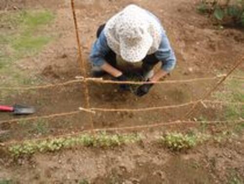 今年は台所の前にゴーヤを植えることにした。そのために、今まで楽しませてくれた小松菜と春菊を取り除いた。春菊の花をダイニングテーブルに飾りました。 地面を耕し、腐葉土と肥料をまいた。2階の窓の柵にシュロの紐を結わいて、ゴーヤが茎をからませるも…